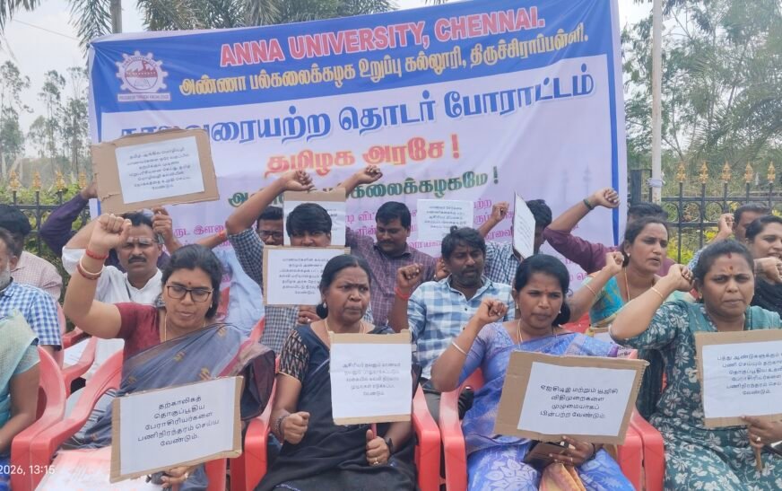 திருச்சி பிப் 07 திருச்சி மாவட்டம் மாத்தூரில் செயல்பட்டு வரும் அண்ணா பல்கலைக்கழக முன்பு 15வருடத்திற்கு மேலாக பணி செய்து