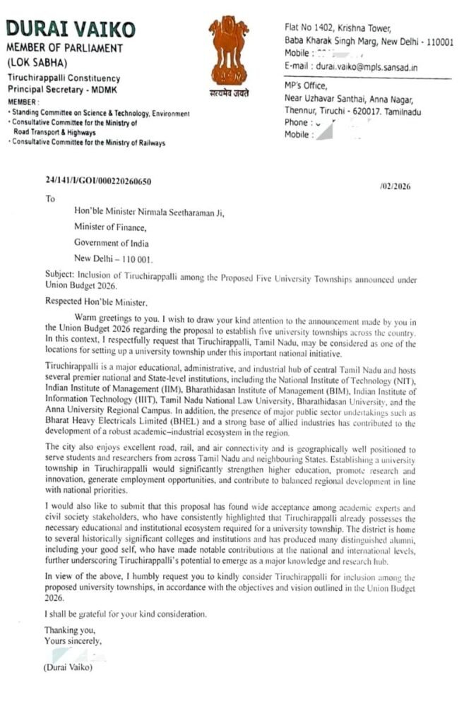 திருச்சி மாவட்டத்தின் கல்வி வளர்ச்சி, தொழில் முன்னேற்றம் மற்றும் இளைஞர்களின் வேலைவாய்ப்பு உருவாக்கத்தை கருத்தில் கொண்டு முன்வைக்கப்பட்ட இந்த கோரிக்கைகளை கவனமாக கேட்டுக் கொண்ட மாண்புமிகு நிதியமைச்சர் அவர்களுக்கு நன்றியை தெரிவித்துக் கொண்டார் துரை வைகோ எம்.பி.