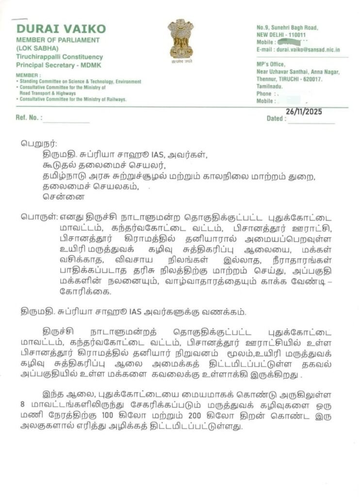 எனது திருச்சி நாடாளுமன்றத் தொகுதிக்குட்பட்ட புதுக்கோட்டை மாவட்டத்தில், கந்தர்வகோட்டை பகுதியில் உள்ள பிசானத்தூர் ஊராட்சியில், பிசானத்தூர் கிராமத்தில், அருகில் உள்ள எட்டு மாவட்டங்களிலிருந்து சேகரிக்கப்படும் மருத்துவக் கழிவுகளை ஒரே இடத்தில் பாதுகாப்பாக அழிப்பதற்காக, உயிரி மருத்துவக் கழிவு சுத்திகரிப்பு ஆலை (Bio-Medical Waste Unit) தனியாரால் அமைக்கப்படத் திட்டமிடப்பட்டுள்ளதற்கு எதிர்ப்பு தெரிவித்து, இந்த மருத்துவக் கழிவு எரியூட்டும் ஆலையை பிசானத்தூர் கிராமத்திலிருந்து மாற்றி, மக்கள் வசிக்காத, விவசாய நிலங்கள் இல்லாத, நீர்நிலைகளுக்கு அருகில் இல்லாத, நீராதாரங்கள் பாதிக்கப்படாத, மக்கள் பயன்பாடு அற்ற தரிசு நிலங்களைத் தேர்வுசெய்து, அந்த இடத்திற்கு மாற்றம் செய்ய வேண்டும் என்று இப்பகுதி மக்கள், குறிப்பாகப் பெண்கள், விவசாயிகள், இளைஞர்கள், கடந்த ஒரு மாதகாலமாக அறவழியில், கட்சி பாகுபாடின்றி, காத்திருப்பு போராட்டத்தை மேற்கொண்டு வருகின்றனர்.