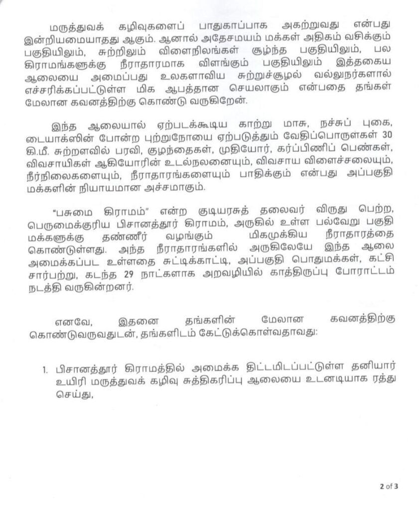 பிசானத்தூர் கிராமத்தில், உயிரி மருத்துவக் கழிவு சுத்திகரிப்பு ஆலை (Bio-Medical Waste Unit) அமைக்க முதற்கட்ட Consent to Establish (CTE) அனுமதி மறுக்கப்படும் என்றும் மாண்புமிகு அமைச்சர் அவர்கள் உறுதியளித்துள்ளார்.