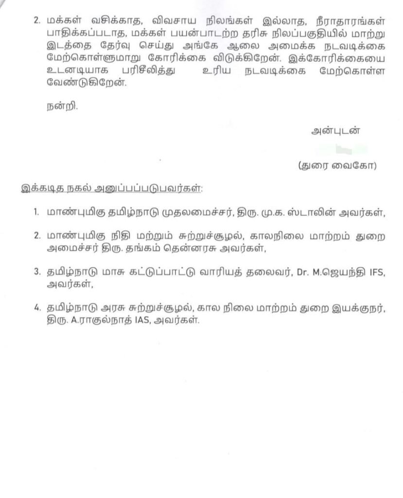 சுற்றுச்சூழல் துறை அதிகாரிகள் மற்றும் மாசுக் கட்டுப்பாட்டு வாரிய அதிகாரிகளுக்கு ஆய்வறிக்கை அனுப்பியுள்ளதாகவும் மாவட்ட ஆட்சித் தலைவர் என்னிடம் தெரிவித்தார்.