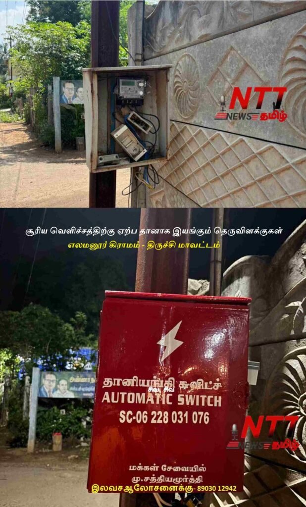 திருச்சி மாவட்டம் ஸ்ரீரங்கம் வட்டம் திருப்பராய்த்துறை வருவாய் கிராமம் எலமனூரில் 5000 ரூபாய் செலவில் சூரிய வெளிச்சத்திற்கு ஏற்ப தானாக இயங்கும் தெருவிளக்கு சுவிட்ச் அமைத்து நாட்டிற்கும் வீட்டிற்கும் பெருமை சேர்த்துள்ளார் எம் ஐ டி யில் படித்த பொறியாளர் சத்தியமூர்த்தி அவர்கள்.