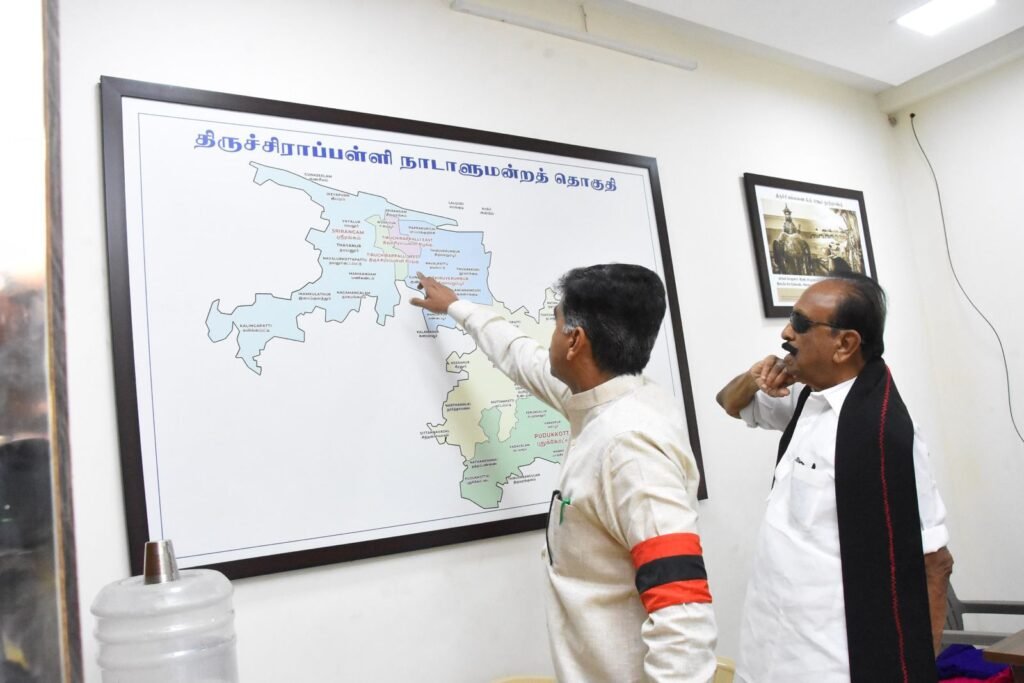 அலுவலகத்திற்குள் நுழைந்த பிறகு அங்கே வைக்கப்பட்டு இருக்கிற திருச்சி நாடாளுமன்றத் தொகுதி வரைபடம் உள்ளிட்ட திருச்சியின் பழமையையும், சிறப்புகளையும் உள்ளடக்கிய படங்களை பார்வையிட்டு மகிழ்ந்தார். .